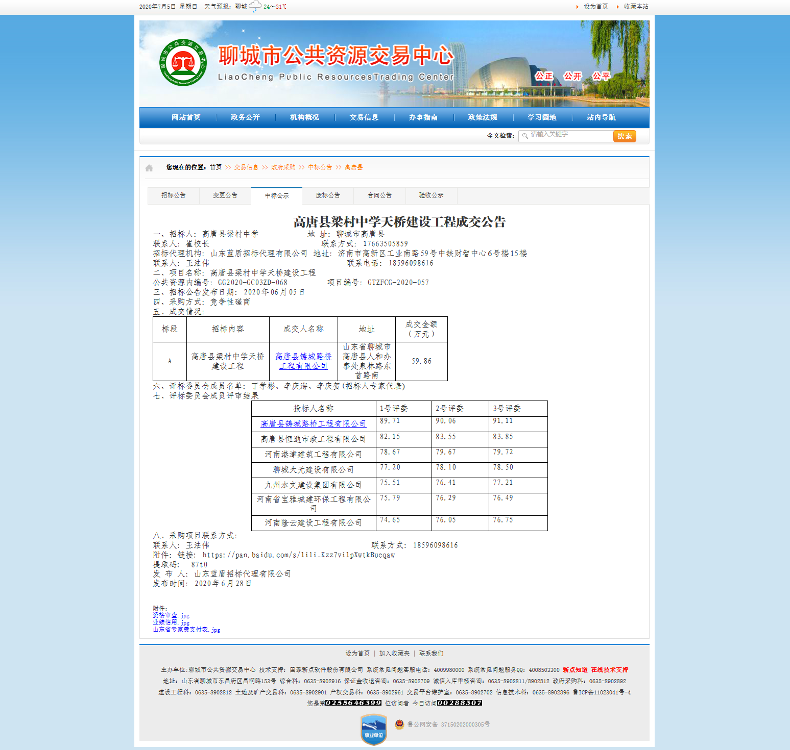 高唐县梁村中学天桥建设工程成交公告