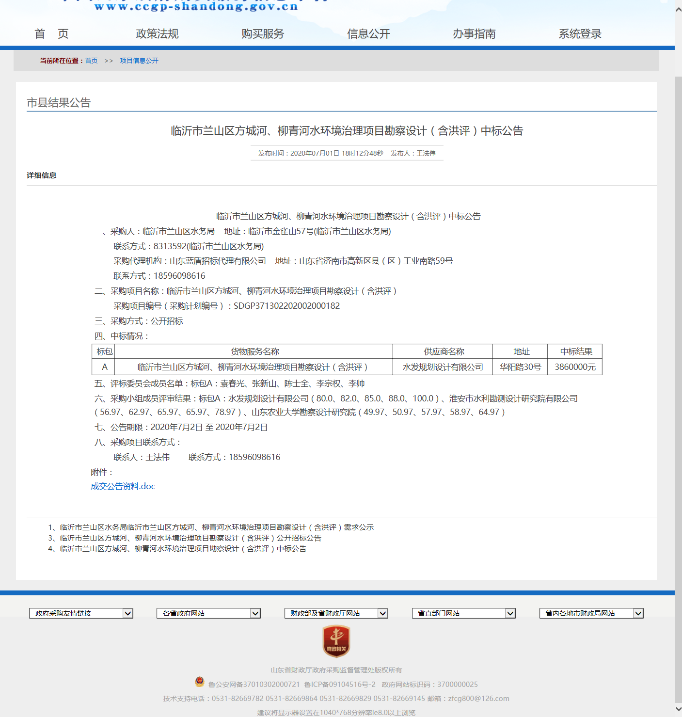 临沂市兰山区方城河、柳青河水环境治理项目勘察设计(含洪评) 中标公示